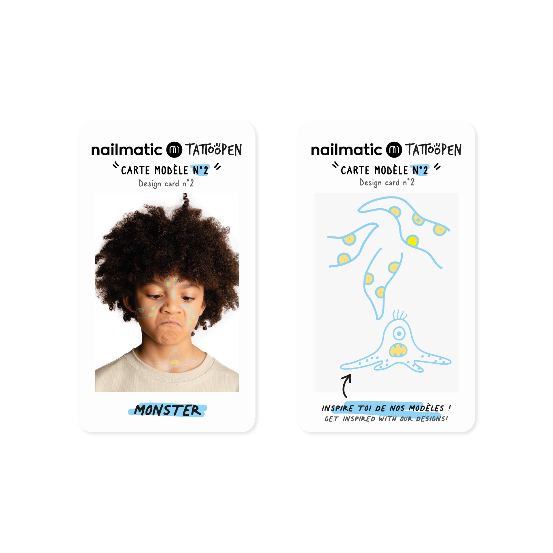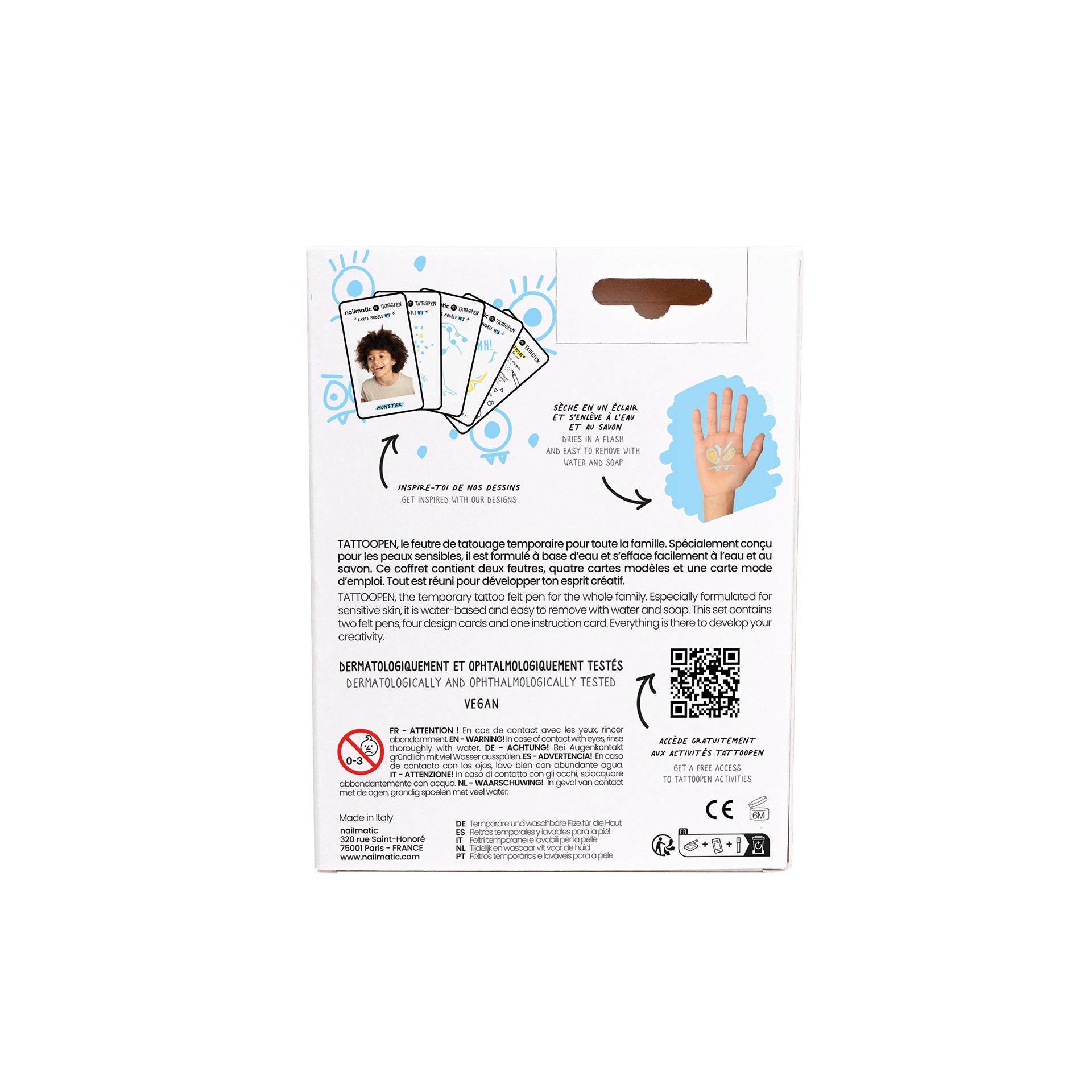 This TATTOOPEN kit contains: - 1 yellow tattoo pen - 1 blue tattoo pen - 4 double-sided cards with ideas to test - 1 double-sided instructions card Our set of monsters temporary tattoo pens? A great tool to explore drawing on skin.
